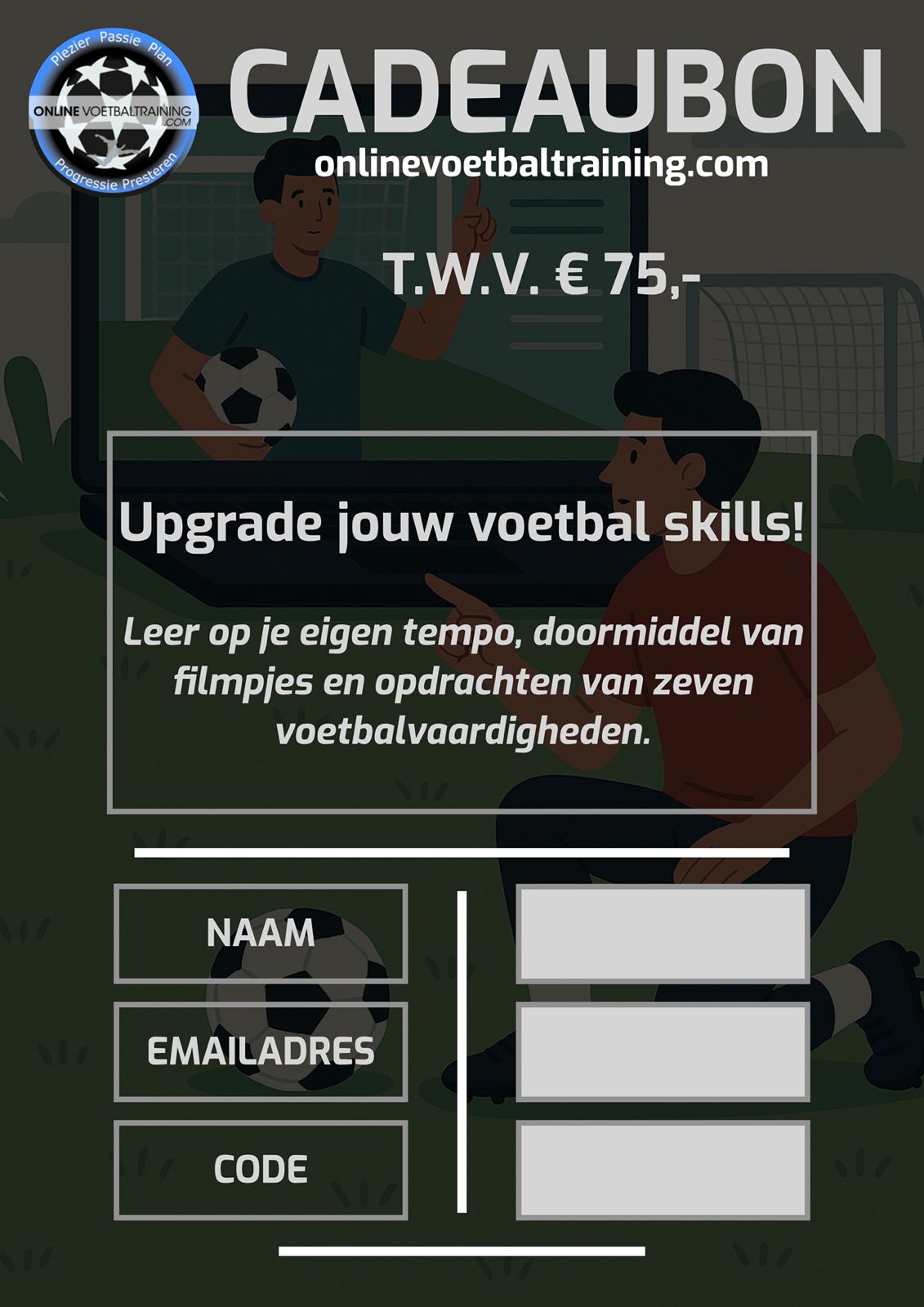 Met onze cadeaubonnen geef je toegang tot de verschillende trainingen, speciaal ontworpen voor de voetballer die zichzelf wilt ontwikkelen. Onze pakketten bieden alles wat nodig is, om van een goede voetballer een echte ster op het veld te maken!